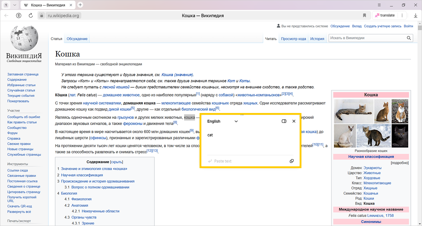 Yandex Browser will prompt you to translate the page if its language is different from your interface language. You can access Yandex Translate or translate specific words, images or videos using the context menu.