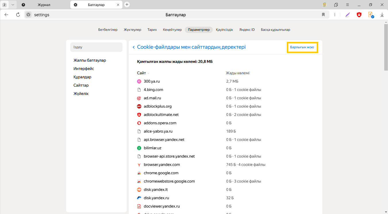 Әдепкі бойынша Яндекс Браузерінде cookie файлдарын сақтауға рұқсат етіледі.