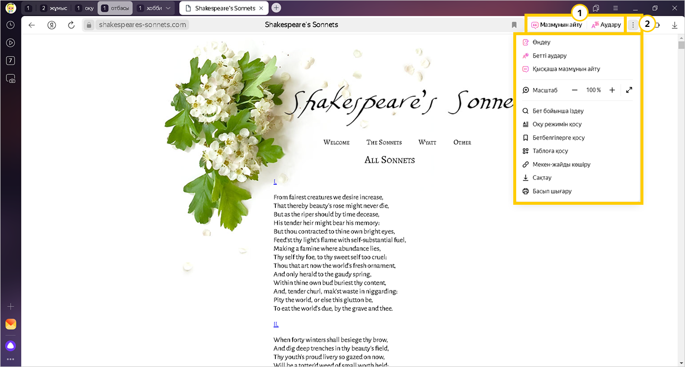 2 — парақшаның мәзірі.