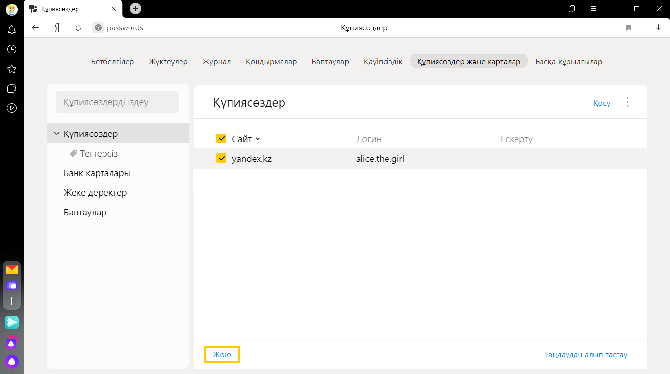 • Құралдар тақтасында құпиясөздер мен карталарға жылдам кіру батырмасын көрсету — егер опцияны қоссаңыз, құпиясөздер мен карталарды  белгішесін басу арқылы аша аласыз.