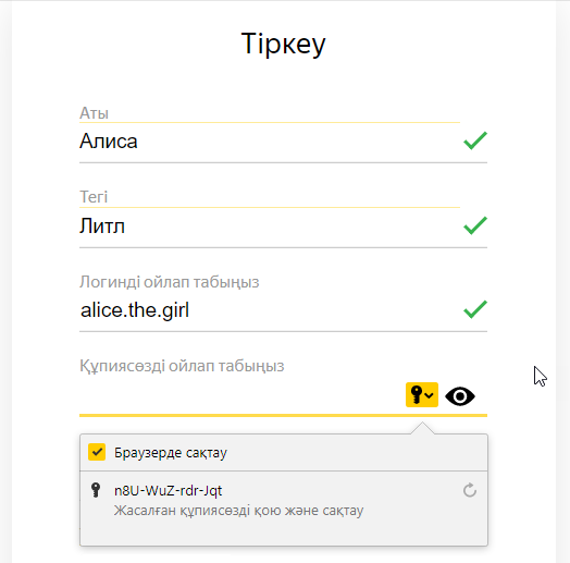 1. Тінтуір меңзерін құпиясөзді енгізу өрісіне орнатыңыз. Браузер құрастырылған құпиясөзді автоматты түрде ұсынады.