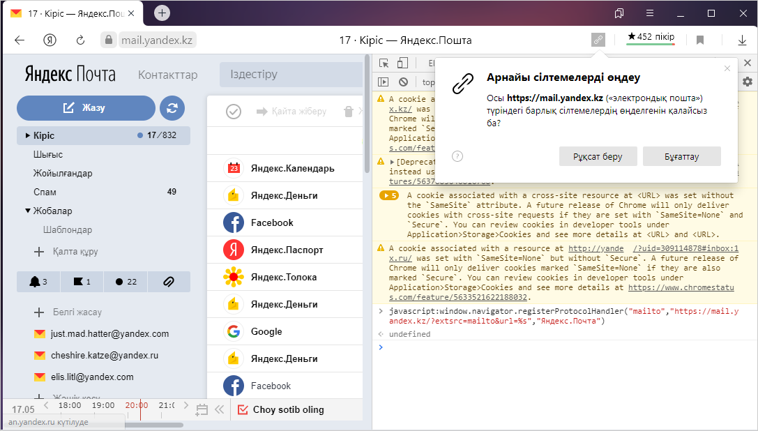 Егер Ақылды жолдың оң жағында белгішесі болмаса, Яндекс Поштаны JavaScript консолі арқылы пошта өңдеушісі ретінде тағайындаңыз: