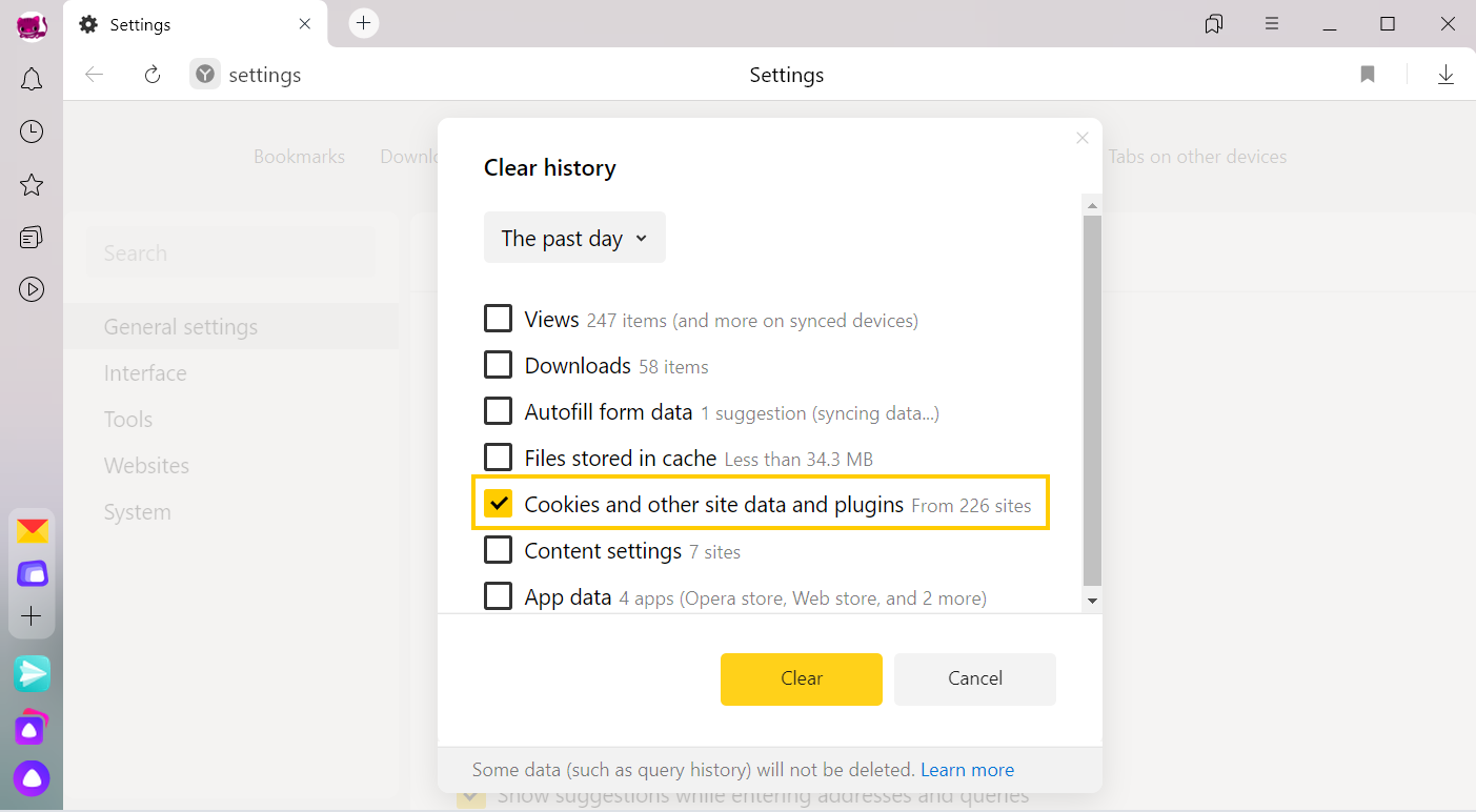 - Select Cookies and other website and plugin data (disable all the other options if you only want to delete cookies).