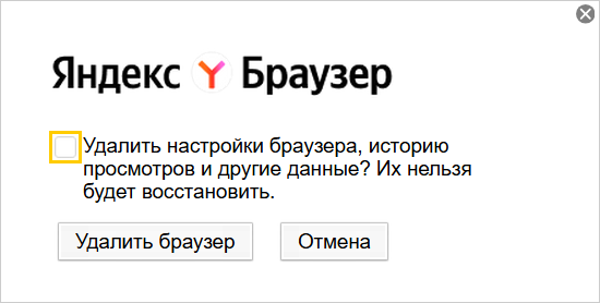 Нажмите Удалить браузер, оставив неактивной опцию Удалить настройки браузера, историю просмотров и другие данные.