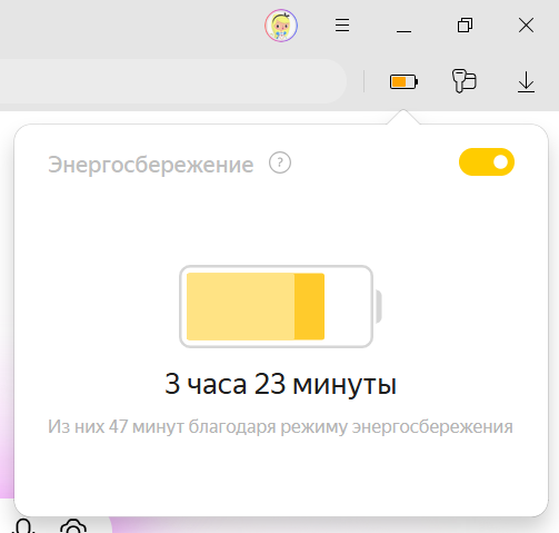 Режим энергосбережения в Яндекс Браузере экономит заряд батареи. Он позволит вам работать на отключенном от электросети ноутбуке на час дольше.