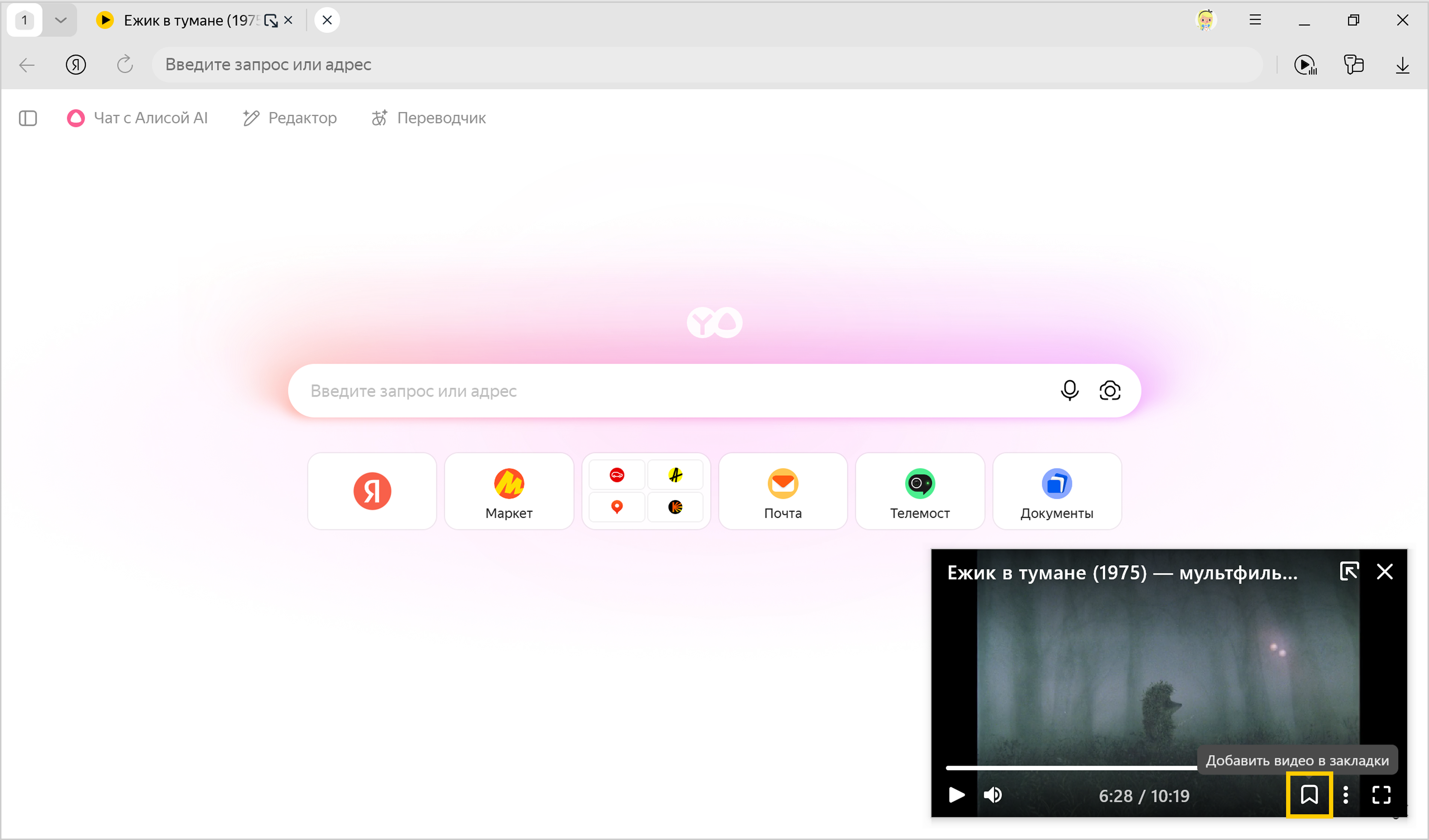 В разделе Закладки отключите опцию Показывать кнопку «В закладки» на видео.