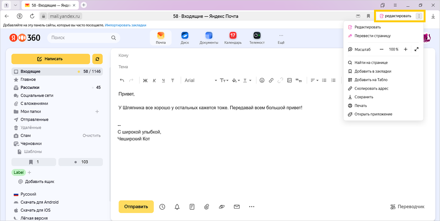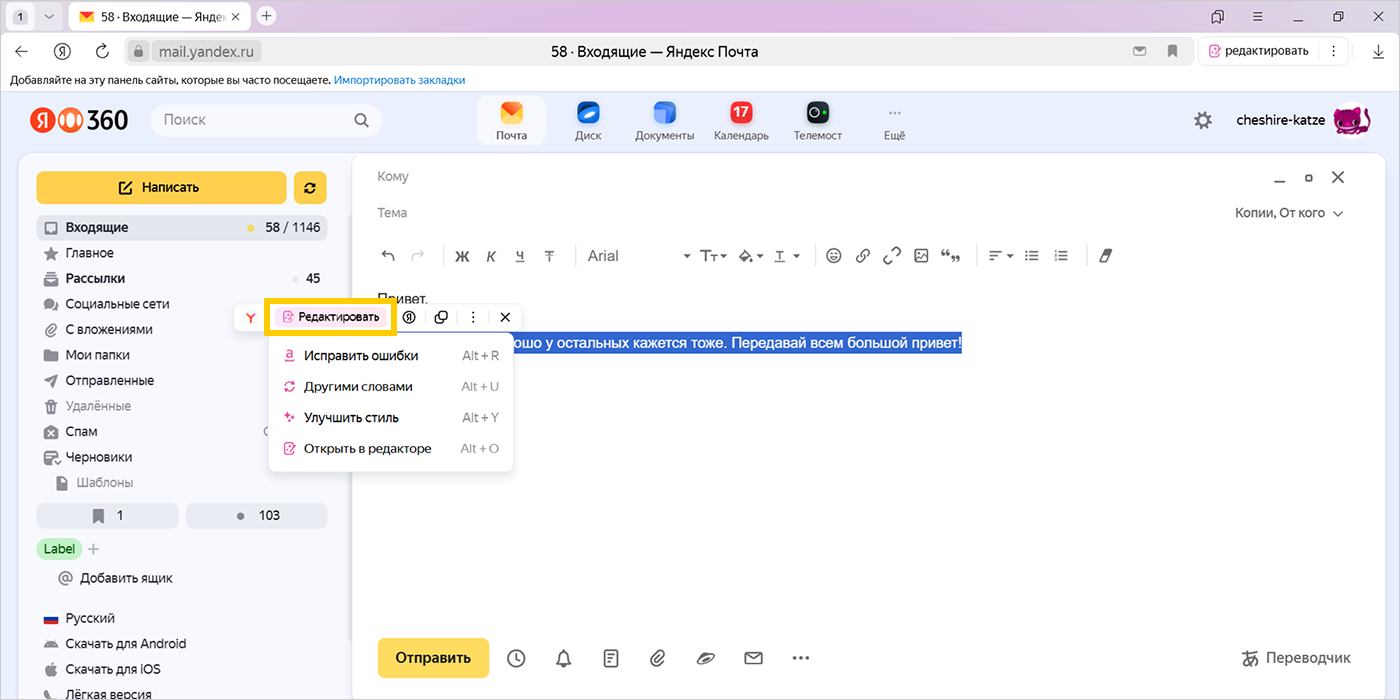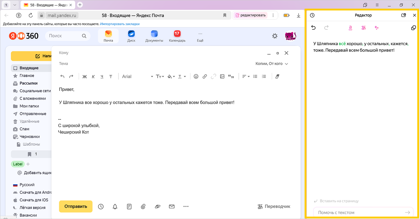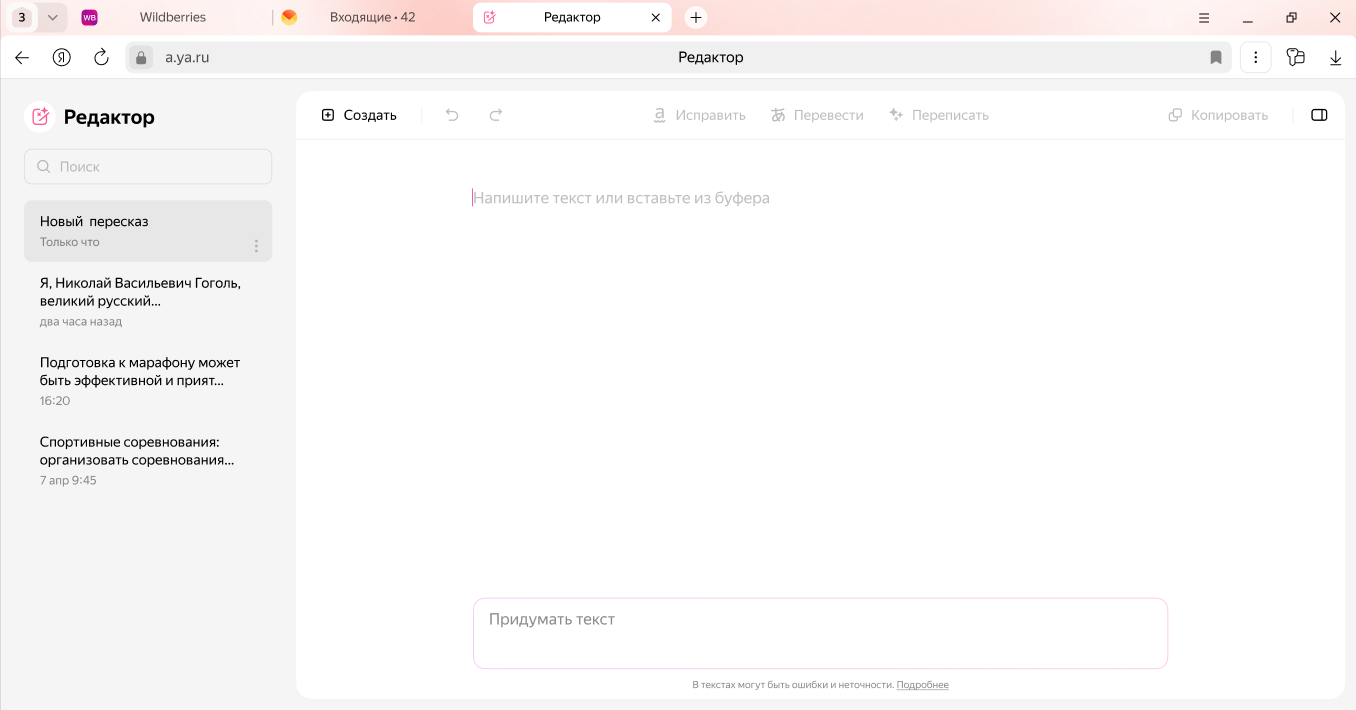 Редактор в Браузере помогает написать, отредактировать и улучшить текст, используя нейросеть YandexGPT. Он исправит ошибки, улучшит стиль, переформулирует или переведет текст на другой язык. Это удобно при подготовке любых текстов: от электронных писем и постов в социальных сетях до научных статей и художественных произведений.