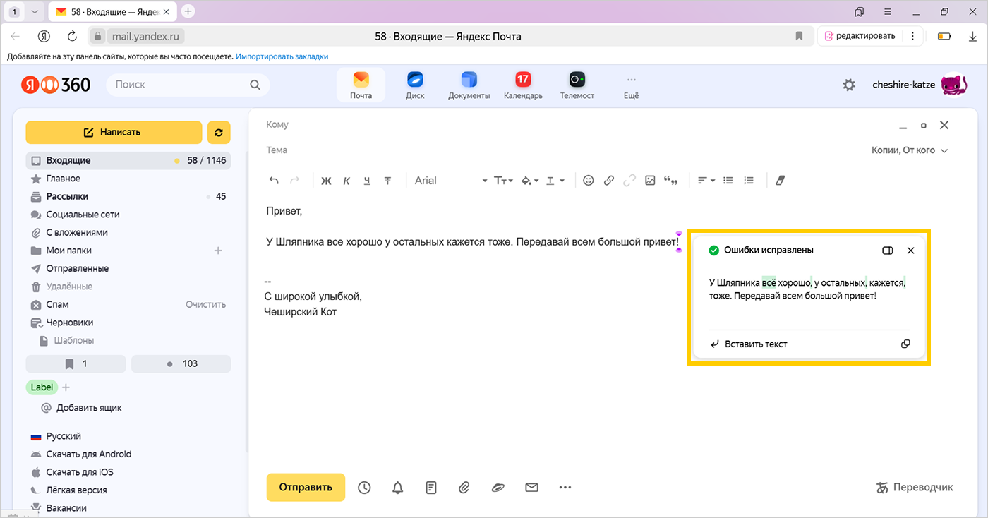 Исправленные слова и символы будут выделены зеленым цветом, а при наведении курсора отобразится исходный вариант. Чтобы вернуть его, нажмите .