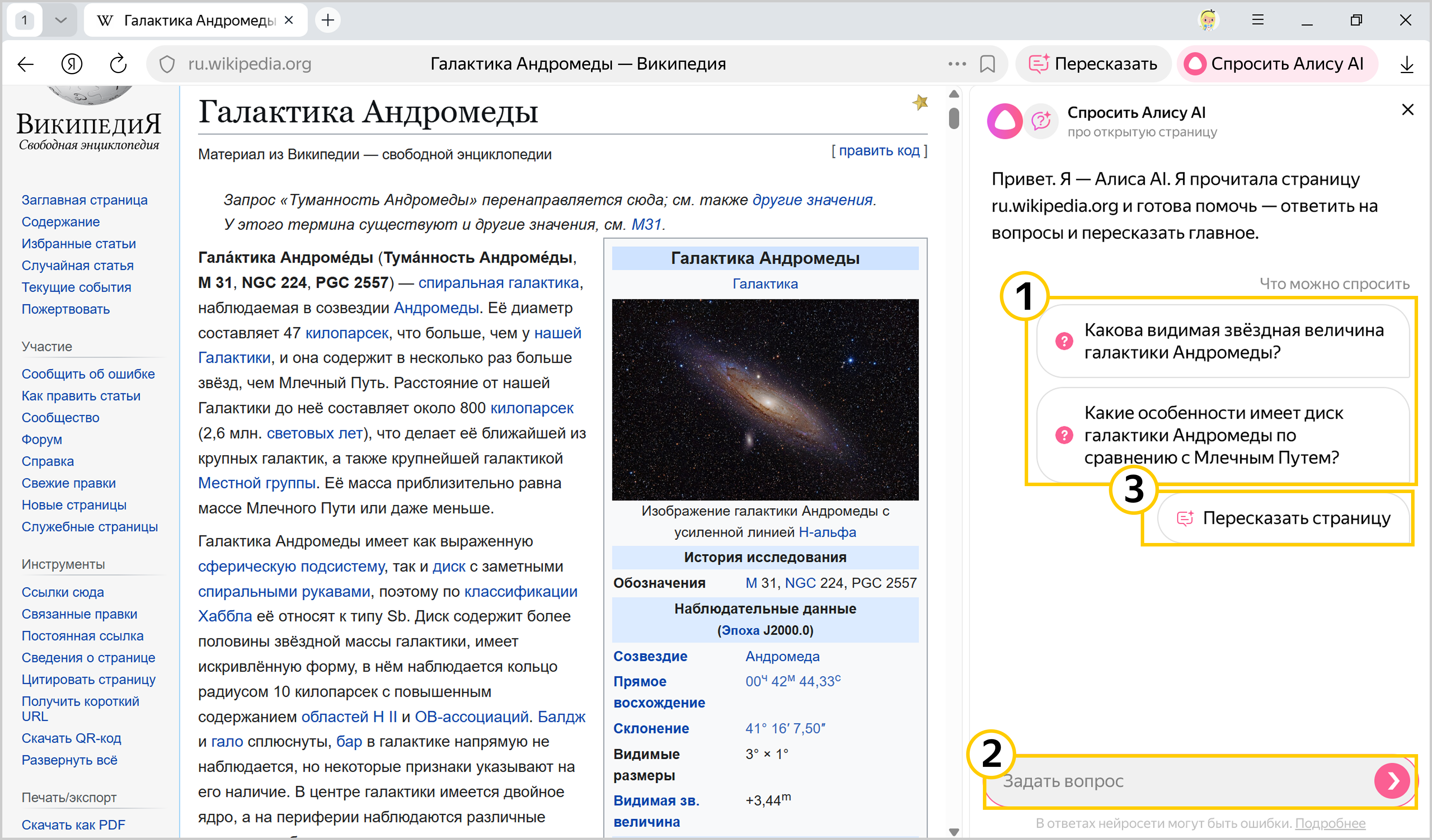 1 Нажмите на один из предложенных Алисой вопросов — они подготовлены с учетом контекста страницы.