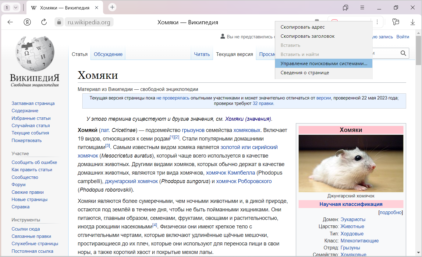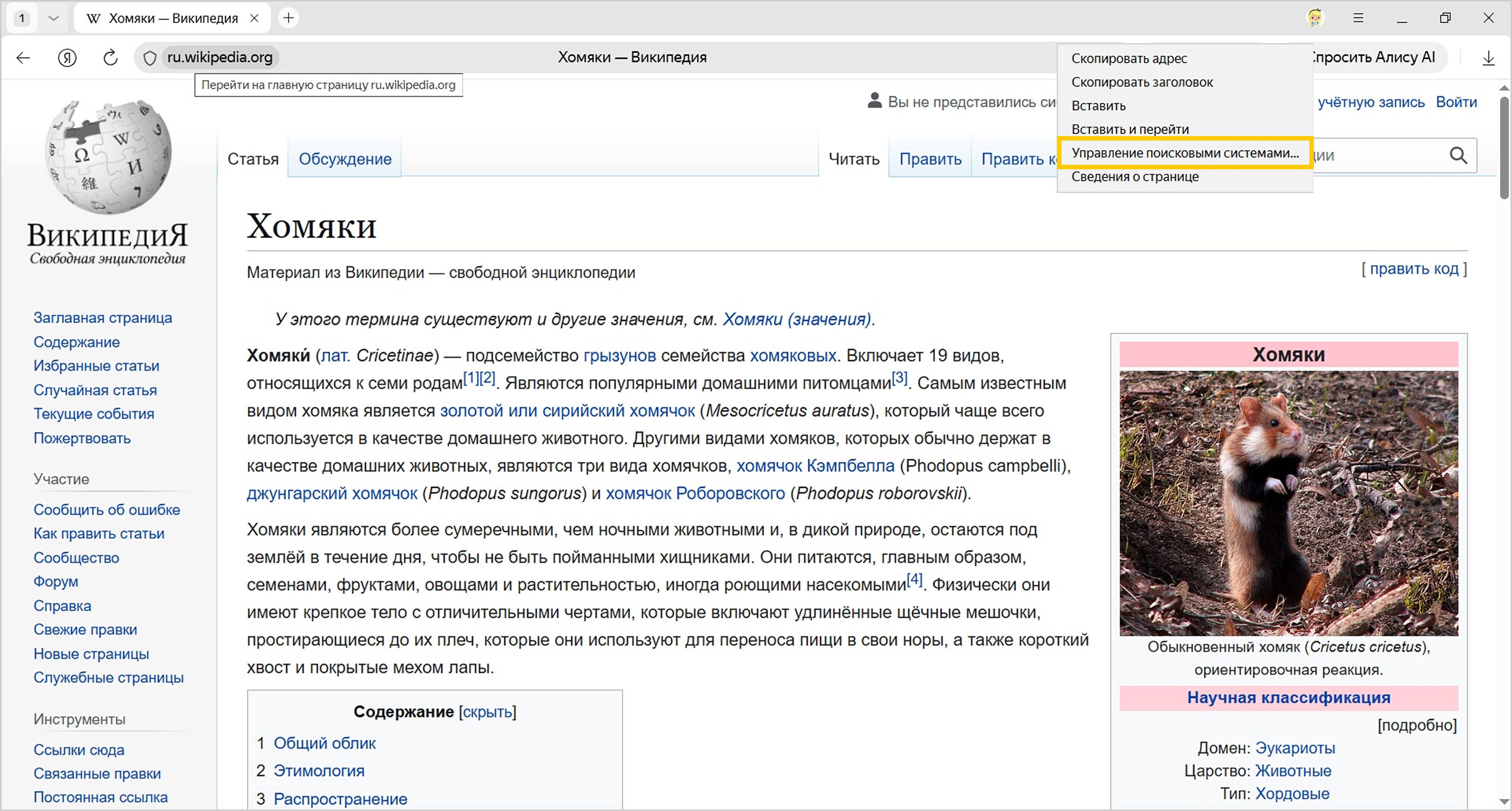 В контекстном меню выберите пункт Управление поисковыми системами...
