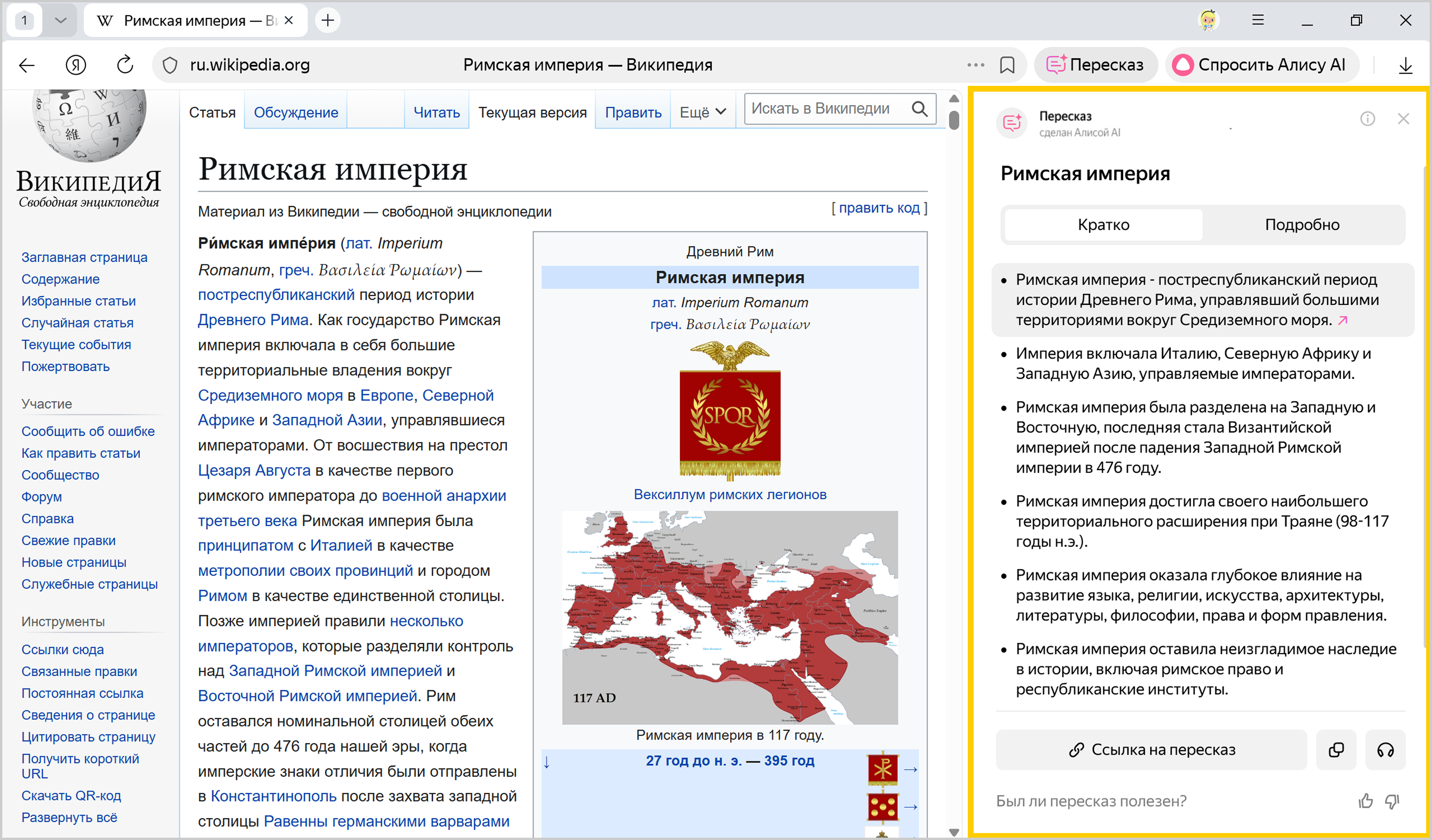 Справа от Умной строки нажмите Спросить Алису AIСпросить Алису AI → Пересказать страницу.