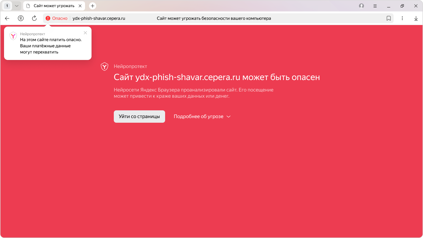 При вводе номера платежной карты Браузер может вывести на экран предупреждение, что присутствует явная угроза кражи данных или проблема с безопасностью. В этом случае в Умной строке появляется значок Опасный сайт и открывается окно с предупреждением.