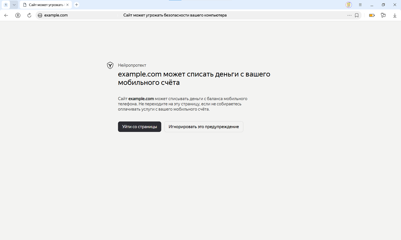 Если вы попадете на страницу сотового оператора с платной подпиской, Яндекс Браузер предупредит вас об этом — появится сообщение в окне Браузера. Нажимайте кнопку Игнорировать это предупреждение только в том случае, если вы планируете оплачивать подписку.