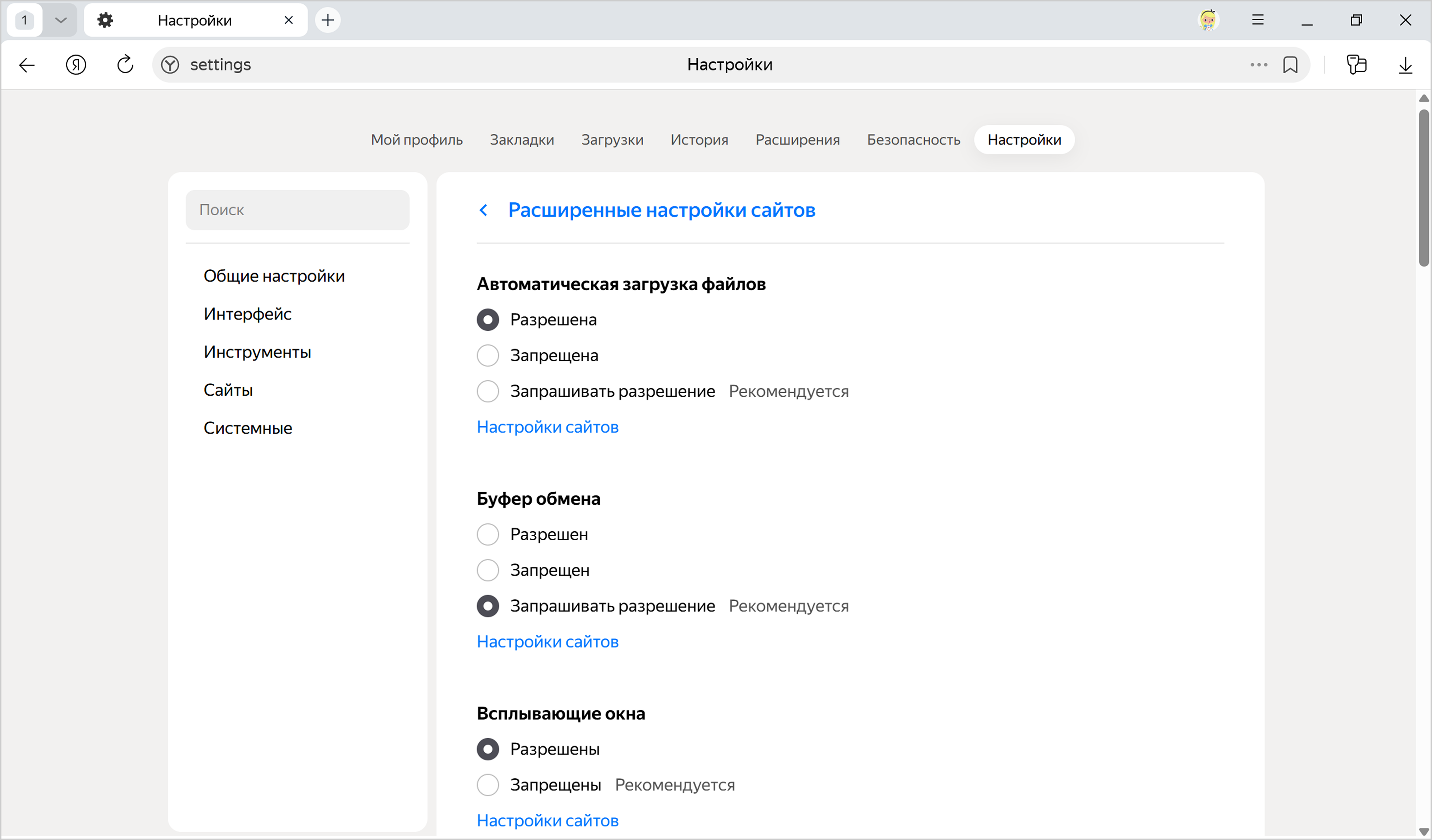 Чтобы сделать ваше пребывание в интернете безопасным и комфортным, Яндекс Браузер применяет к элементам сайтов правила обработки. Он блокирует всплывающие окна, предупреждает о запросе сайтом местоположения и т. д. С помощью панели Нейропротект или в настройках вы можете изменить поведение Браузера для всех сайтов или для выбранного. Например, вы можете запретить запускать на всех сайтах JavaScript или разрешить выбранному сайту доступ к видеокамере.