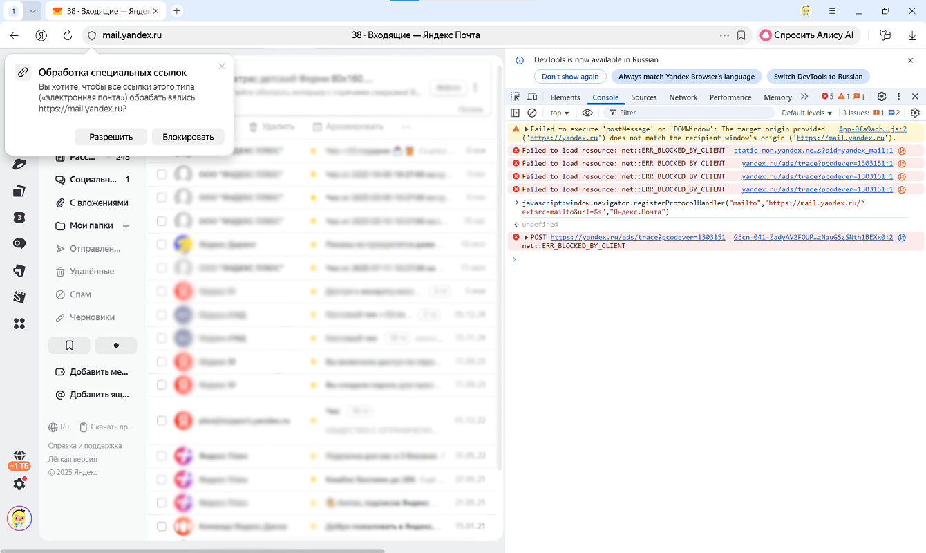 Если Яндекс Браузер не предлагает назначить почту обработчиком протокола по умолчанию, вы можете сделать это с помощью консоли JavaScript: