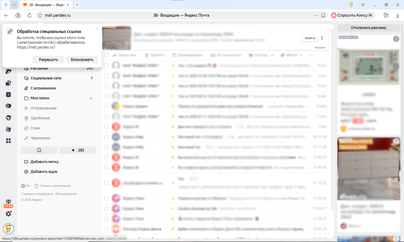 Когда вы в первый раз открываете Яндекс Почту в Браузере, он предлагает назначить ее обработчиком протокола по умолчанию. Для этого слева вверху во всплывающем окне Обработка специальных ссылок выберите Разрешить.