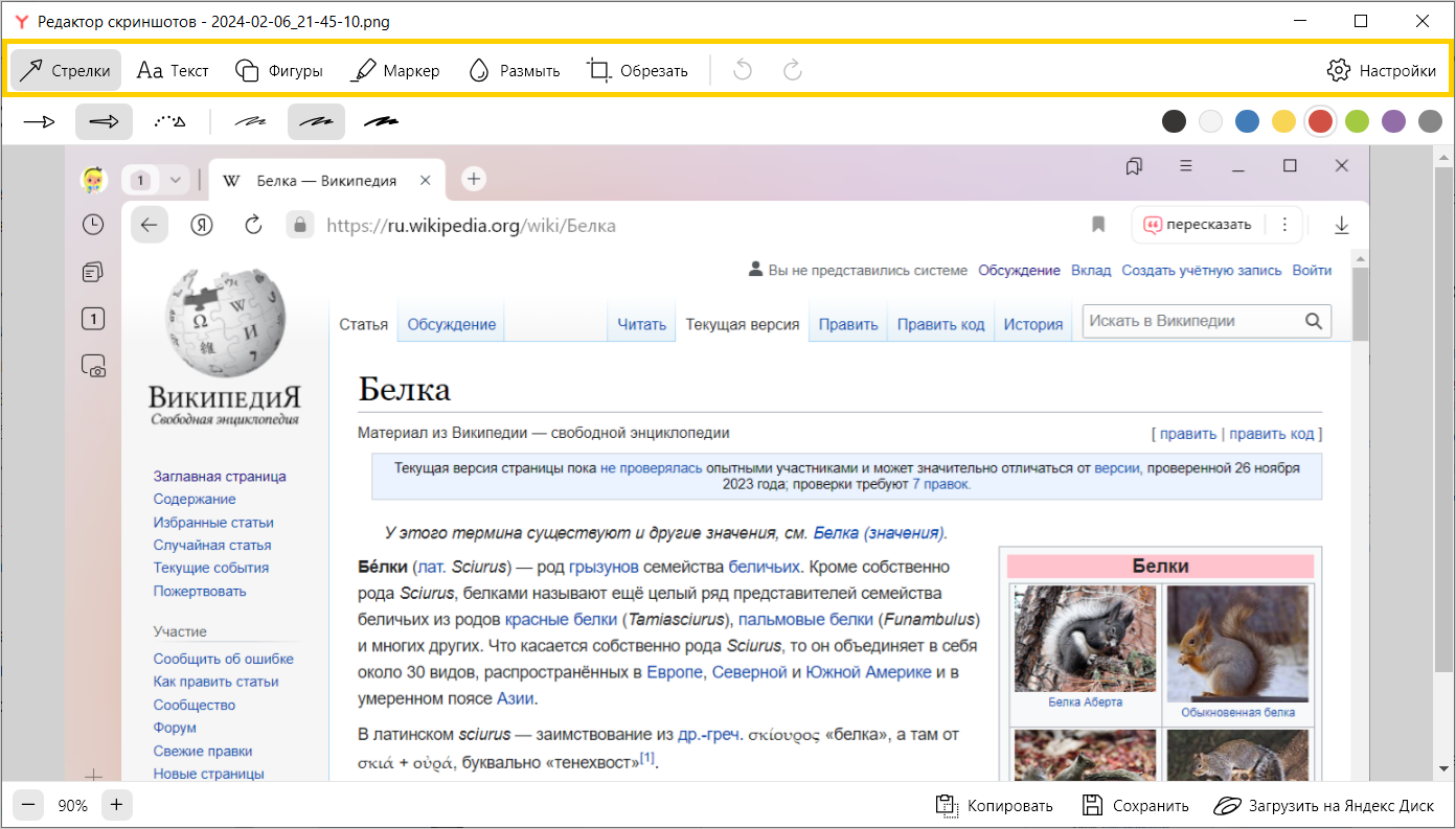 В Яндекс Браузере можно делать скриншоты экрана, выделенной области или всей страницы, редактировать изображение, добавлять стрелки и надписи. Вы можете отправить скриншот друзьям или в техподдержку.