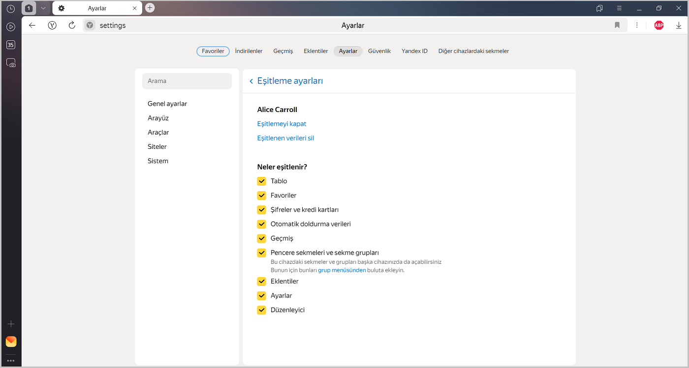 Varsayılan olarak eşitlenen veriler: Tablo, favoriler, giriş şifreleri, banka kartı bilgileri, otomatik doldurulan veriler, tarama geçmişi, Yandex Browser sekmeleri veya sekme grupları (bunları gruplar menüsü üzerinden buluta yüklediyseniz), eklentiler ve ayarlar.