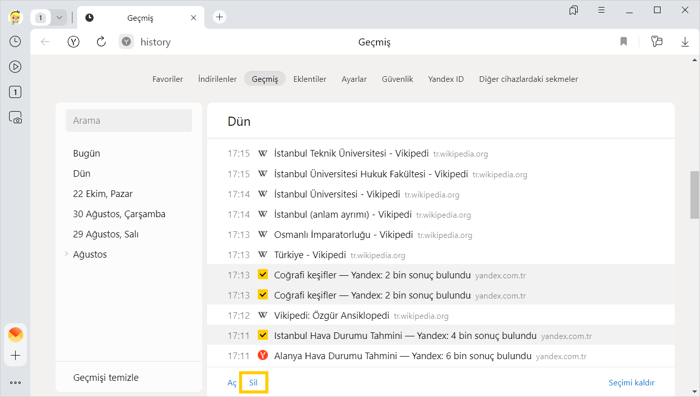 Tüm geçmişi görmek için  → Geçmiş → Tüm geçmiş ögesine tıklayın veya Ctrl + H tuşlarına basın.