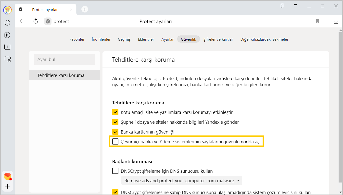 Tehditlere karşı koruma bölümünde Çevrimiçi banka ve ödeme sistemlerinin sayfalarını güvenli modda aç seçeneğini devre dışı bırakın.