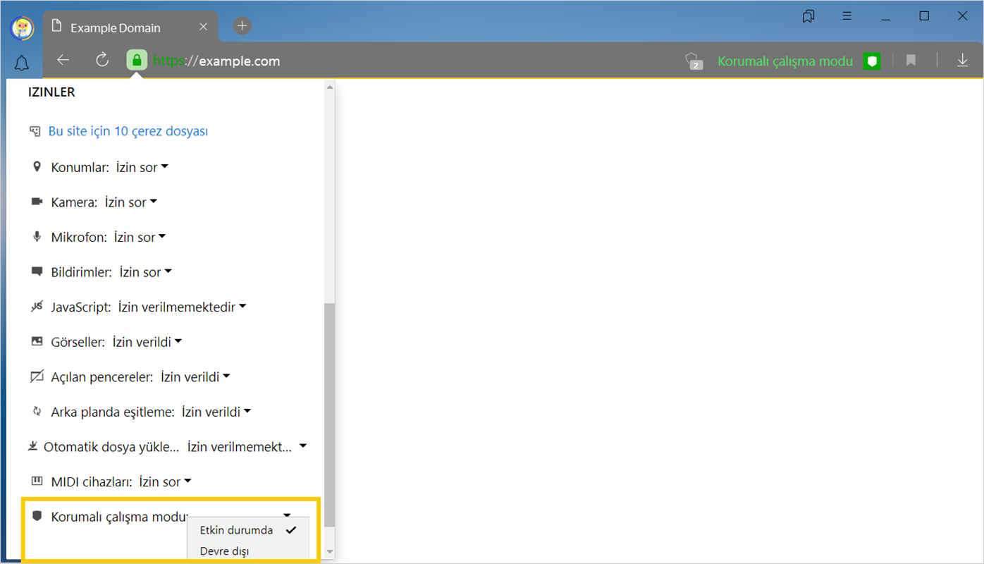 Korumalı çalışma modunun otomatik başlatılması için HTTPS protokolüne göre çalışan bir sayfayı özel listeye ekleyebilirsiniz: