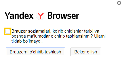 7. Kompyuteringizdan brauzer ma’lumotlarini oʻchirib tashlamoqchi boʻlsangiz, ochilgan oynada Brauzer sozlamalari, brauzer tarixi va boshqa ma’lumotlarni oʻchirish bandini yoqing.