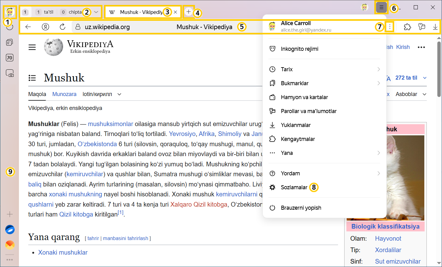 Interfeysdan foydalanish qulay bo‘lishi uchun Yandex Brauzer o‘rgatuvchi ishoralarni ko‘rsatadi. Agar ular sizga xalaqit qilsa, ularni o‘chirib qo‘ying: