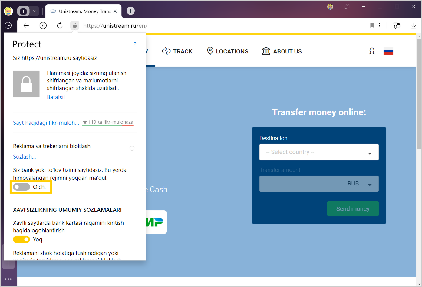 Agar siz onlayn to‘lov sahifasini ochsangiz va interfeys o‘zgarishini ko‘rmasangiz, himoyalangan rejimni majburiy ravishda yoqing.