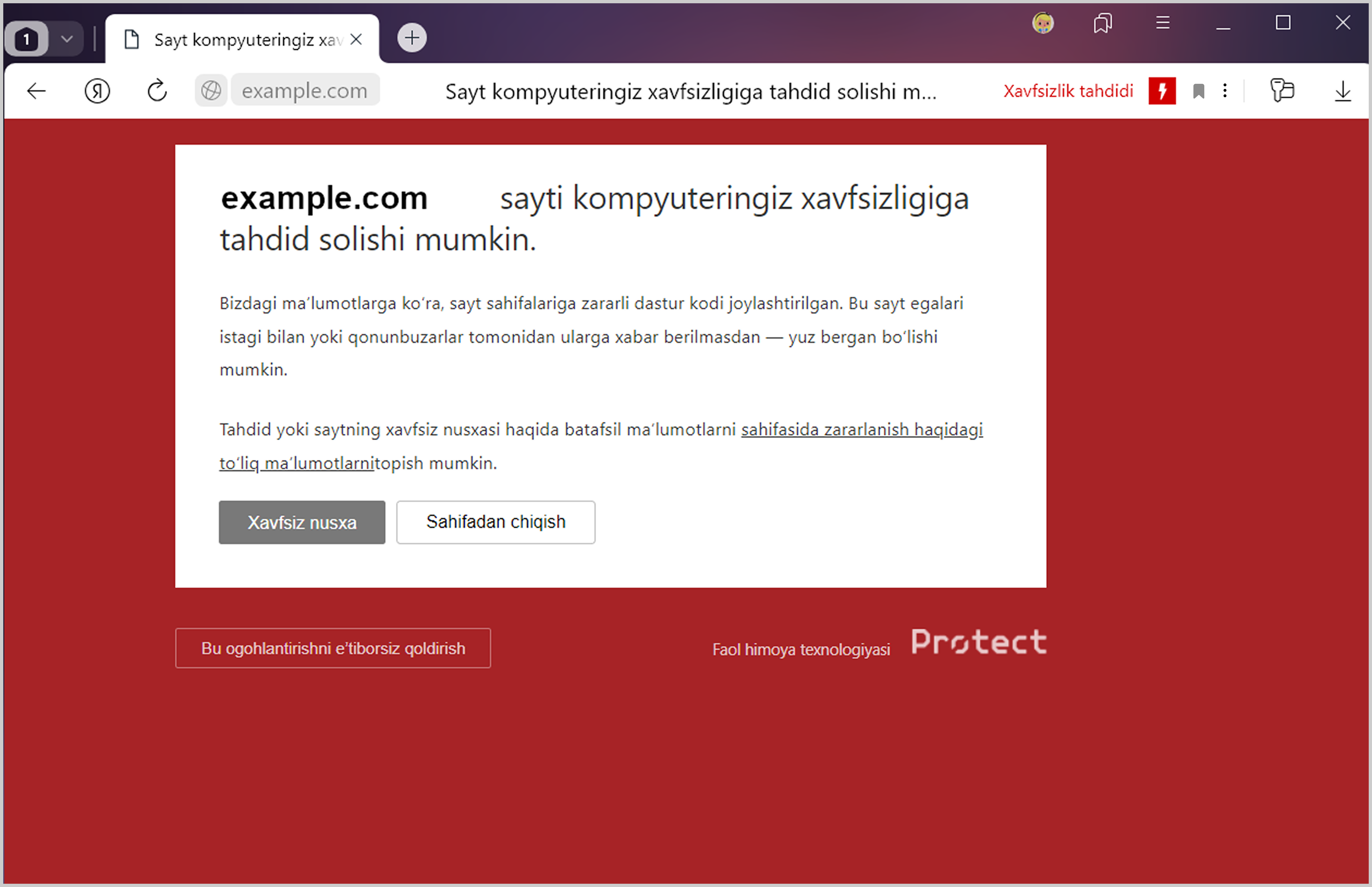Agar sahifa zararli DT bilan zararlangan bo‘lsa, Brauzer sizni bu haqida ogohlantiradi.
