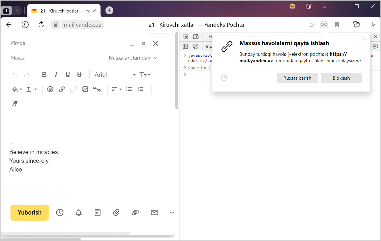 Agar Aqlli satrning o‘ng tomonida belgisi bo‘lmasa, JavaScript konsoli yordamida Yandex Pochtani qayta ishlovchi sifatida tayinlang: