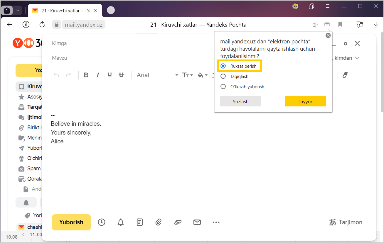 Brauzerda Yandex Pochtani birinchi marta ochganingizda, u standart protokol qayta ishlovchisi sifatida tayinlashni taklif qiladi: