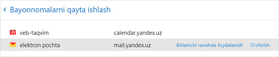 Yandex Brauzer sozlamalarida elektron pochta va taqvim uchun sukut bo‘yicha ishlatiladigan veb-xizmatni berish mumkin.
